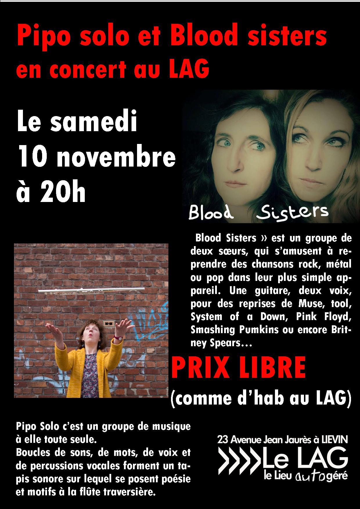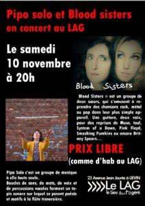 | « Blood Sisters » est un groupe de deux sœurs, qui s’amusent à reprendre des chansons rock, métal ou pop dans leur plus simple appareil. Une guitare, deux voix, pour des reprises de Muse, tool, System of a Down, Pink Floyd, Smashing Pumkins ou encore Britney Spears… | Pipo Solo c’est un groupe de musique à elle toute seule. Boucles de sons, de mots, de voix et de percussions vocales forment un tapis sonore sur lequel se posent poésie et motifs à la flûte traversière. |
