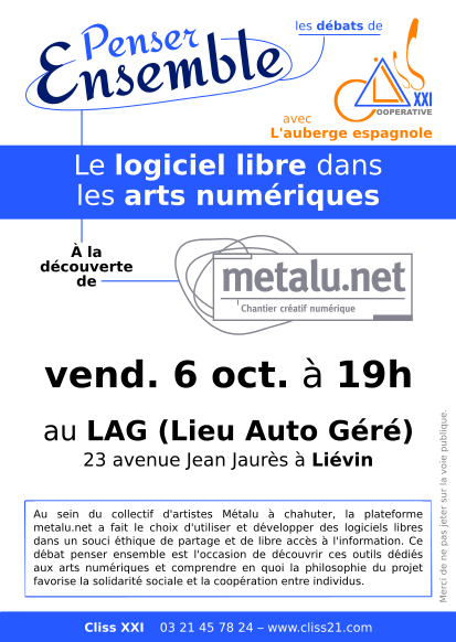 Cet échange Penser ensemble est à la fois une bonne occasion de rencontrer et d’échanger avec des membres de Metalu.net, et de s’interroger sur les liens entre création artistique et numérique (et, dans le cas de Metalu.net, de numérique en appui sur l’informatique libre).