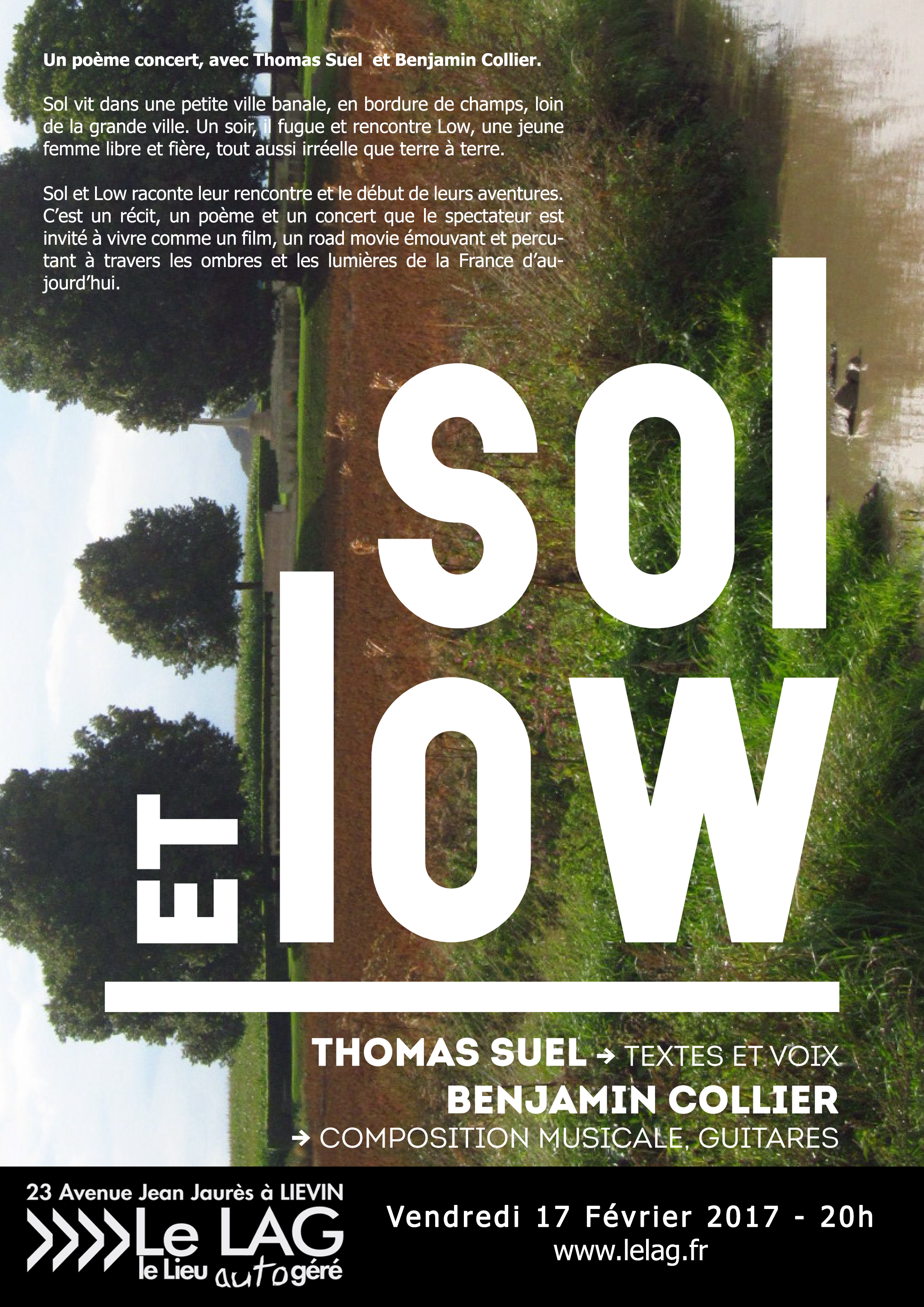Sol vit dans une petite ville banale, en bordure de champs, loin de la grande ville. Un soir, il fugue et rencontre Low, une jeune femme libre et fière, tout aussi irréelle que terre à terre. Sol et Low raconte leur rencontre et le début de leurs aventures. C’est un récit, un poème et un concert que le spectateur est invité à vivre comme un film, un road movie émouvant et percutant à travers les ombres et les lumières de la France d’aujourd’hui.